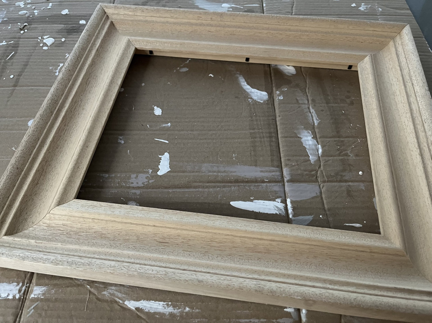Bespoke natural moulded obeche wood frames are hand cleaned and sanded in preparation for painting.